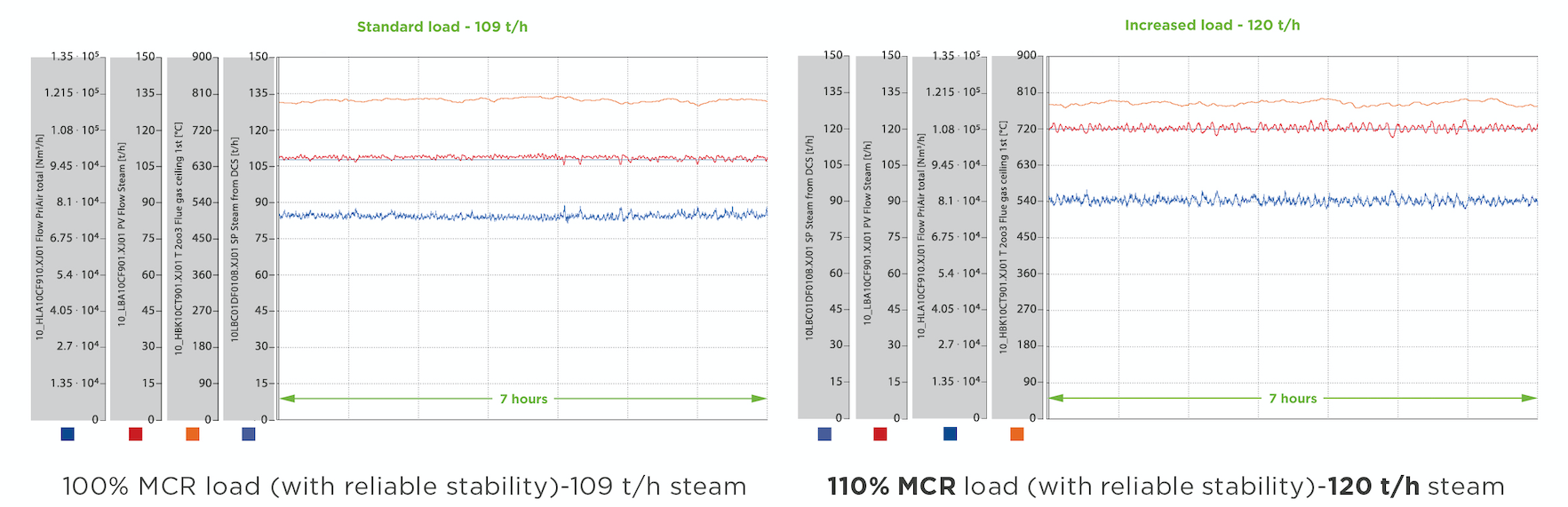 A case of such an improvement is shown in the accompanying diagrams. In this special case, no hardware changes were necessary, and the steam generation was very stable even at 110% MCR. The combustion improvement was carried out 100% automatically.