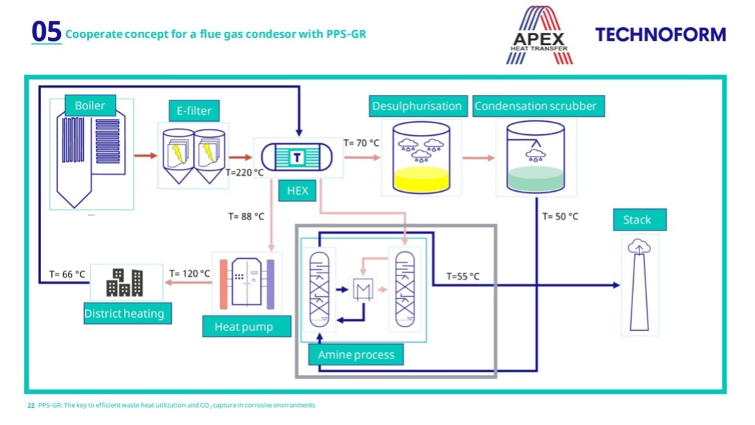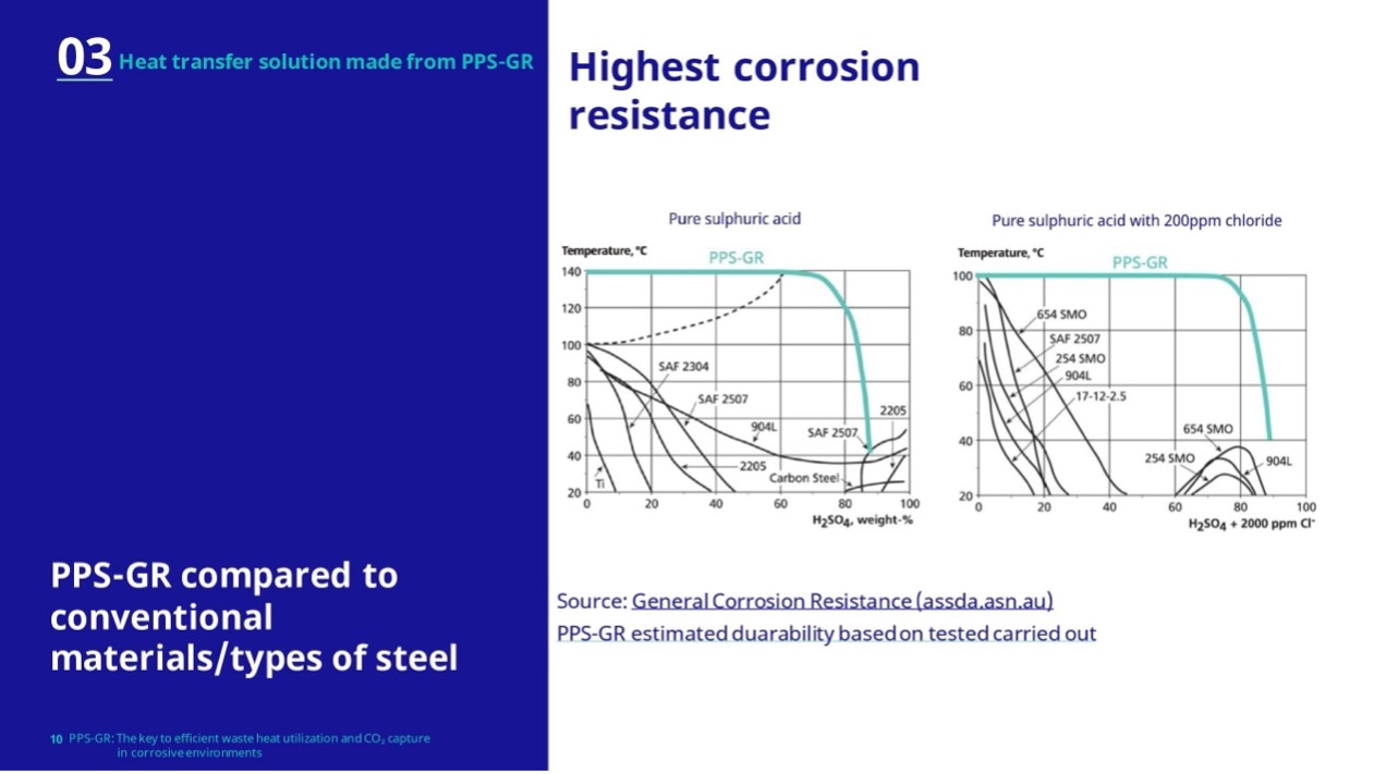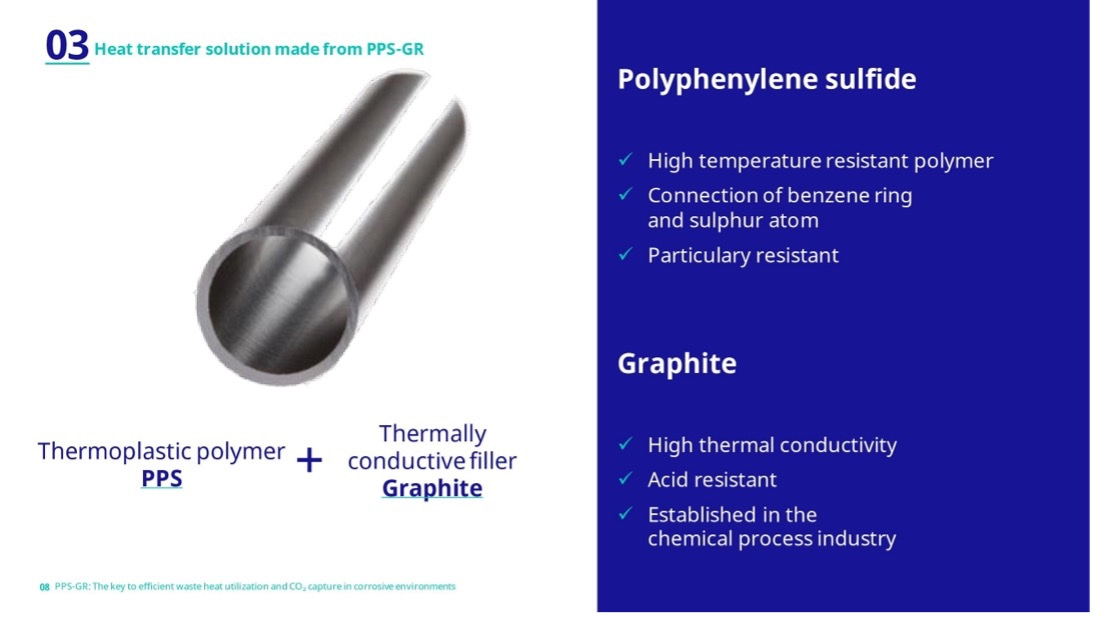 There is already an exemplary project in biogas combustion, where PPS-GR heat exchanger tubes have been proving themselves in a true test case since 2018 until today – a combination of high internal pressure, challenging temperatures, and condensation of mixed acids. Thanks to their resistance to sulfuric acid, hydrochloric acid, and hydrofluoric acid, these tubes have opened new possibilities and proved how heat sinks and sources can be efficiently coupled. The optimization of carbon capture through the targeted use of PPS-GR emphasizes the relevance of this innovative material.