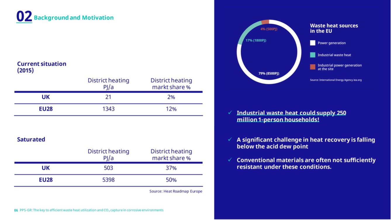 The Europe waste heat market was valued at USD 19.8 billion in 2022 and is set to grow strongly in the coming years (Ankit Gupta, Shashank Sisodia: 2023). Energy efficiency is the driver for economical operation. Still, massive amounts of heat remain unutilized. The corrosion resistance of polymer-based heat transfer materials enables the use of heat below the acid dew point of flue gas. Thereby, heat recovery is maximized, and additionally processed water can be produced.